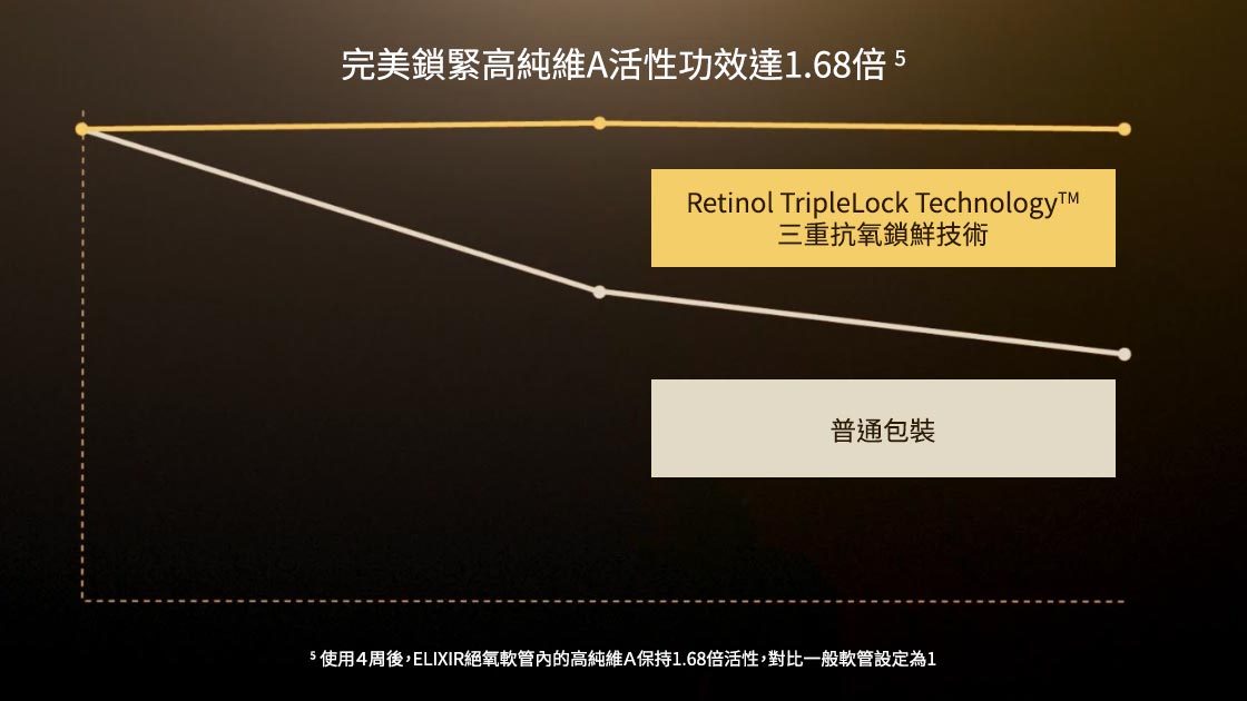 5使用4周後,ELIXIR絕氧軟管內的高純維A保持1.68倍活性,對比一般軟管設定為1