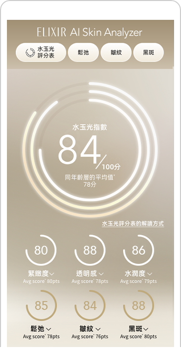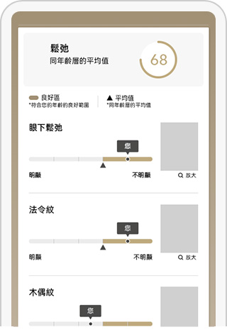 可以透過分析結果的分數,與同年齡層的肌膚平均值作比較。